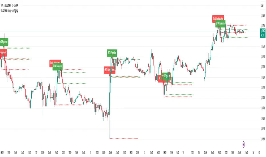 The 08:30 & 09:30 Manipulation-Expansion indicator identifies key market levels at two critical times during the trading session: 08:30 (Manipulation) and 09:30 (Expansion). It visually marks the high and low of these bars and provides real-time alerts when price breaks these levels.