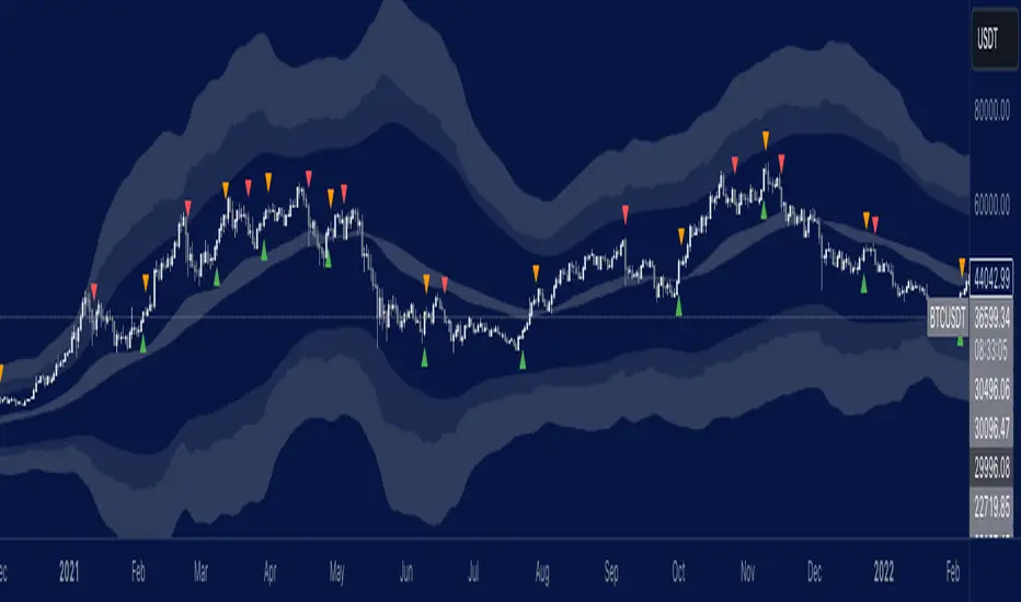 ● Wait for the opposing trend condition with orange triangles in the outer bands.