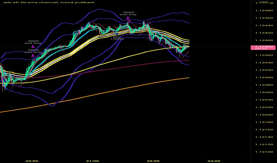 Hi so this strategy is based off 50 ema channel and the 15 ma crossing it to generate signals. But with my adjusted strategy it's a 10 rma crossing 50 ema channels and a 5 and 9 wma to help see pullbacks. 50 period bollinger bands to gage volatility a0nd help during range markets. The strategy signals are generated when longer period efi is above 0 and shorter period efi is below zero and price has pulled back near 50 ema to buy long. And the reverse for shorts, I made this to help me trade more mechanically and to trade 1 minute time frame, that's where the strategy seems to Excell the most, I developed it on eur usd but a brief check seems like it still is profitable on gbp usd aud usd usd jpy I only trade the forex market so not sure about stocks and crypto. If you get signals I would place buy stops and sell stops above high and low of respective signal candle and let price take you into trade. Also adx 20 has to be greater than 20 to take trades. Let me know if this is helpful. I've only been coding for a month so it might look sloppy the way it's coded also there are a few other buy and sell conditions left in the source code if you want to switch between different buy and sell triggers, they all produce good results on 1 min timeframe