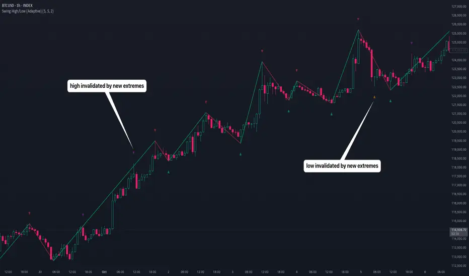 The Indicator is a pivot point detection tool that identifies swing highs and lows with invalidation tracking. The key differentiator of this indicator is its adaptive invalidation system. Most pivot indicators simply mark every detected pivot without considering whether subsequent price action has made earlier pivots less relevant.