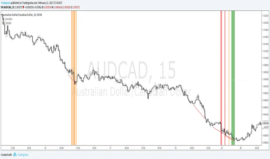 The indicator searches for instances where there is a Knoxville divergence combined with multiple time frame RSI Oversold/Overbought conditions.