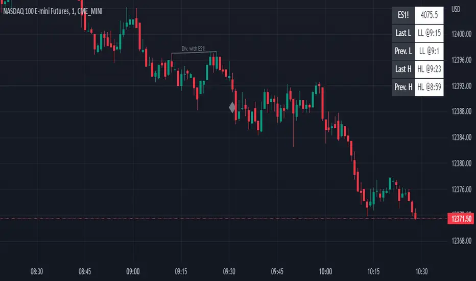 If indicator is set to track SP vs NQ, while SP is main symbol, if you set to get bearish divergence only if there is formed last swing higher high (HH) point for it, on this way there will be no divergence on SP vs NQ if there is formed HL point. On this way indicator will wait to get only HH on SP while on NQ must be formed HL. There is a lot possibility to do settings on your own way for this, since you can set H and L points separately for each type of divergence.