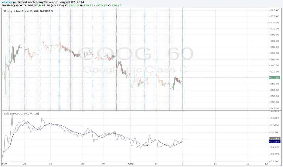 The Comparative Relative Strength indicator is calculated by dividing one security's price by a second security's price (the "base" security). The result of this division is the ratio, or relationship, between the two securities.