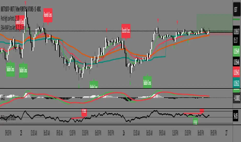This is a custom Pine Script v5 indicator for TradingView titled "EMA 8/21/50 + VWAP Crossover Alert Indicator" (short title: "EMA+VWAP Cross Alert"). It's designed as an overlay indicator, meaning it plots directly on your price chart rather than in a separate pane. The primary purpose is to detect and alert on crossovers between the 8-period Exponential Moving Average (EMA) and the 21-period EMA, which can signal potential bullish or bearish momentum shifts. These are classic short-term trend reversal or continuation signals often used in trading strategies like momentum or swing trading.