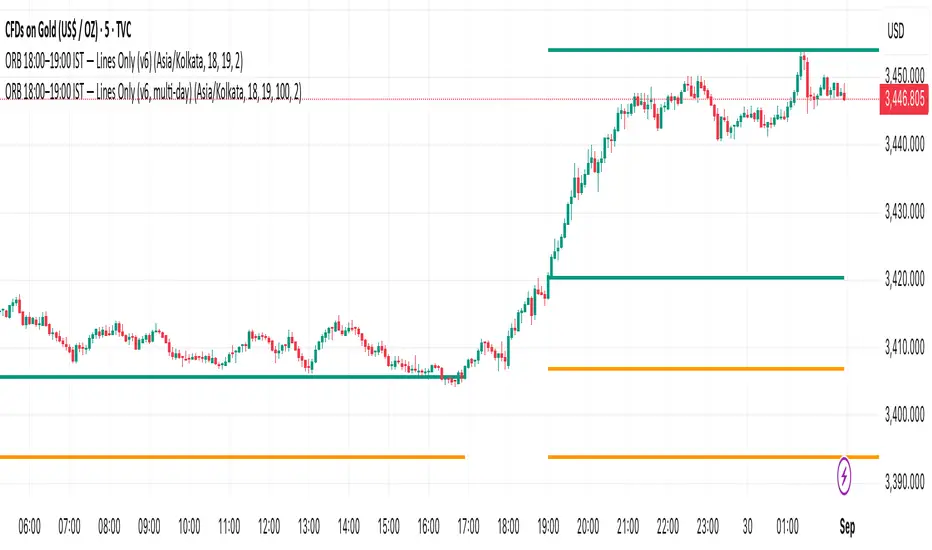 Draws a simple Opening Range for 24/7 markets using a custom time window. By default it captures the high and low formed between 18:00 and 19:00 IST each day, then locks those levels at 19:00 and extends two horizontal lines to the right. No alerts, no signals—pure levels so you can track breakouts or traps manually.