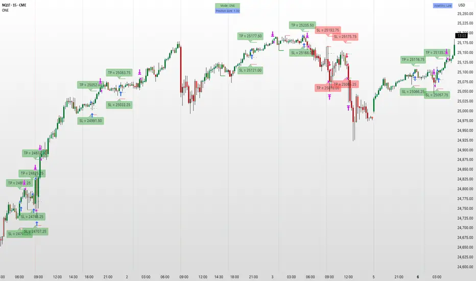 ONE is an adaptive strategy designed for all markets that captures short-term momentum in high-volatility conditions. It integrates RSI, volume analysis, chop filters, standard moving averages, and custom moving averages to identify when markets shift from range-based choppiness to high-probability opportunities. The system is structured to be reactive, focusing on trades with strong volatility expansion and statistically favorable win potential.