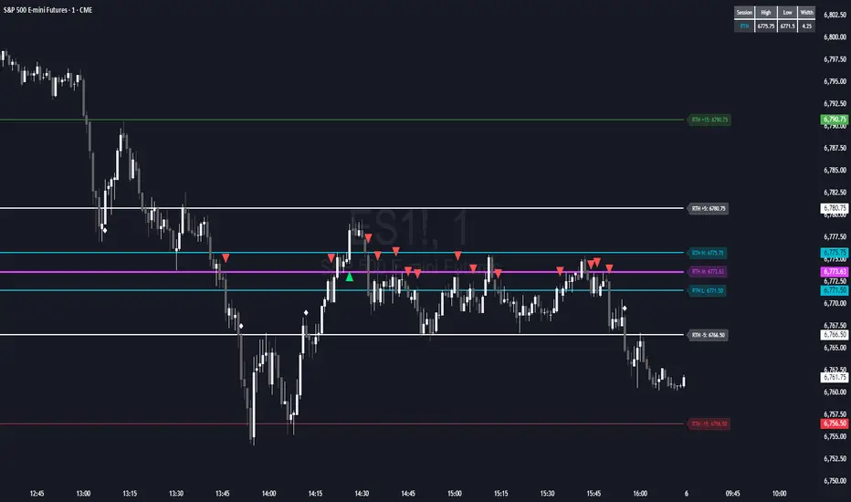 RTH-Specific Feature: Plots 5 levels above and below RTH opening range at 15-point intervals