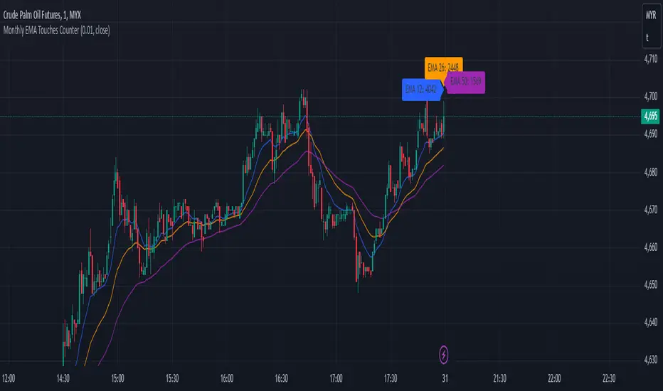 Monthly Touch Counters: Separate counters (touchCountEMA12, touchCountEMA26, touchCountEMA50) are used to count touches for each EMA.