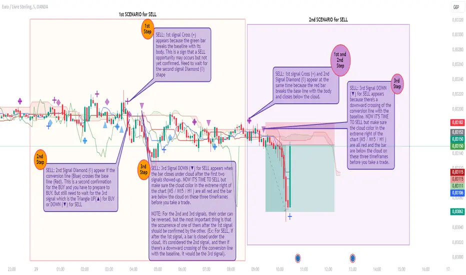 Indeed, this script uses the open-source Ichimoku Cloud standard. However, the additional features I've implemented, such as the display of different signals (e. g : Cross (+) “First signal” to warn about BUY or SELL opportunities that could arise, Diamond (◊) “Second signal” to warn about BUY or SELL preparation and Triangle UP(▲) or DOWN (▼) “Third and last signal” for BUY or SELL NOW action) as well as the ability to configure ALERTS related to these signals are not included in the standard Ichimoku Cloud script and are also not reproduced by the Ichimuko Cloud script.