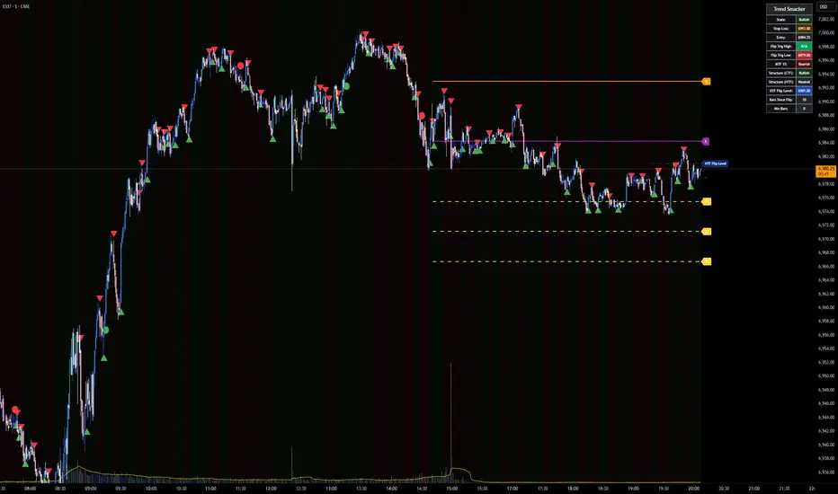 Trend Smacker is a comprehensive trend detection and trade management indicator that identifies precise trend reversals and generates entry signals with built-in stop-loss and target management. By combining real-time trend flip detection with multi-timeframe confirmation, the indicator provides traders with a structured approach to capturing directional moves while maintaining disciplined risk management.