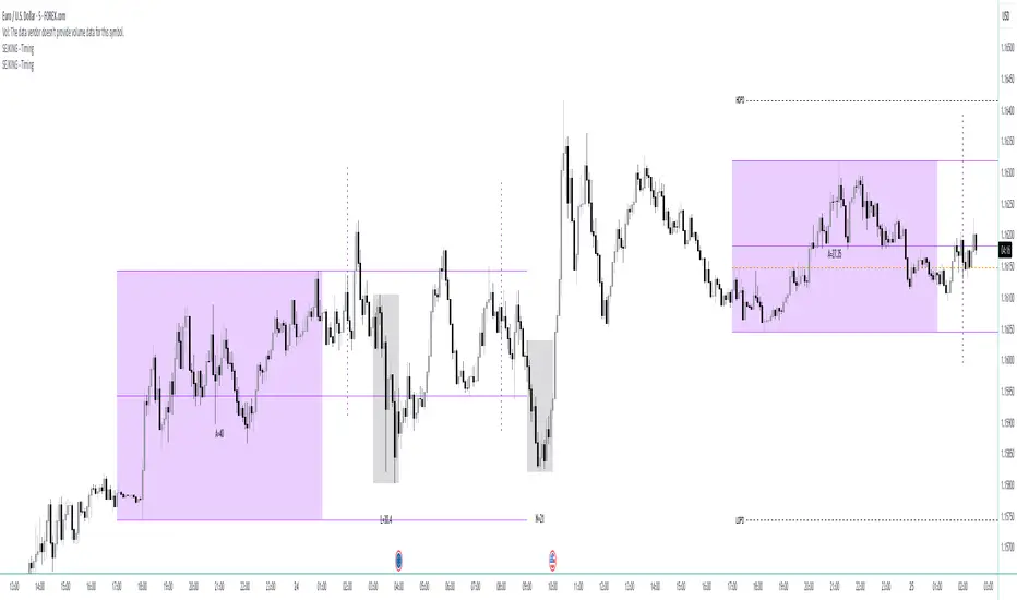 The SEJKING - Timing indicator is a sophisticated trading tool designed for intraday traders who focus on key market sessions. It provides visual cues for Asian, London, and New York trading sessions, highlights important price levels, and delivers volatility metrics - all in one comprehensive package.