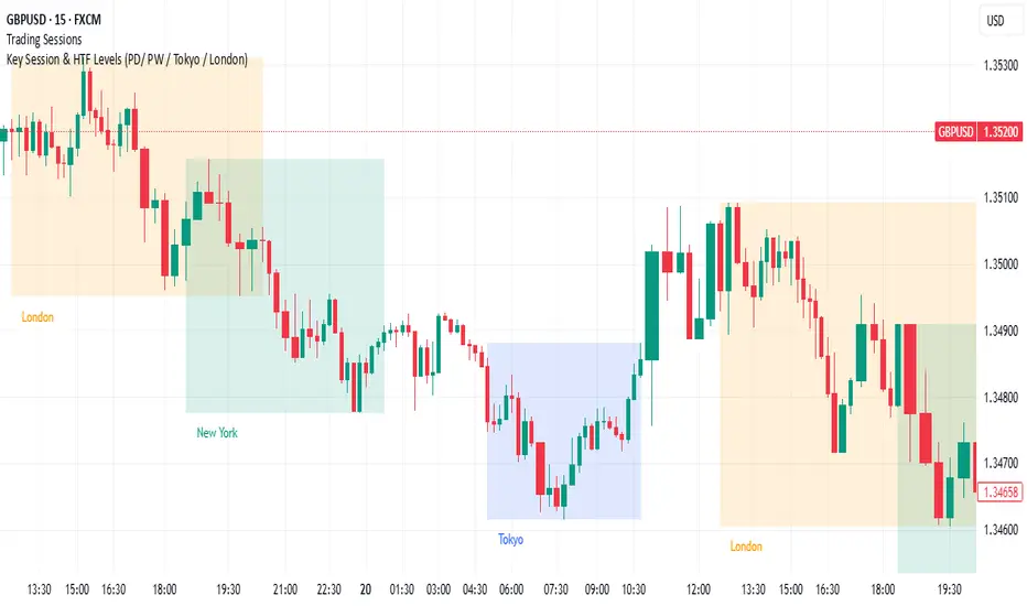 This indicator helps traders track key price levels for multiple timeframes and trading sessions. It plots: