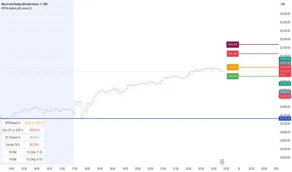 - ATR % Passed - Shows the current passed ATR as of average of last 10 days without taking into account biggest 2 and smallest 2 bars taking into account also the gap. The number after “/“ sign shows the true range in dollars.