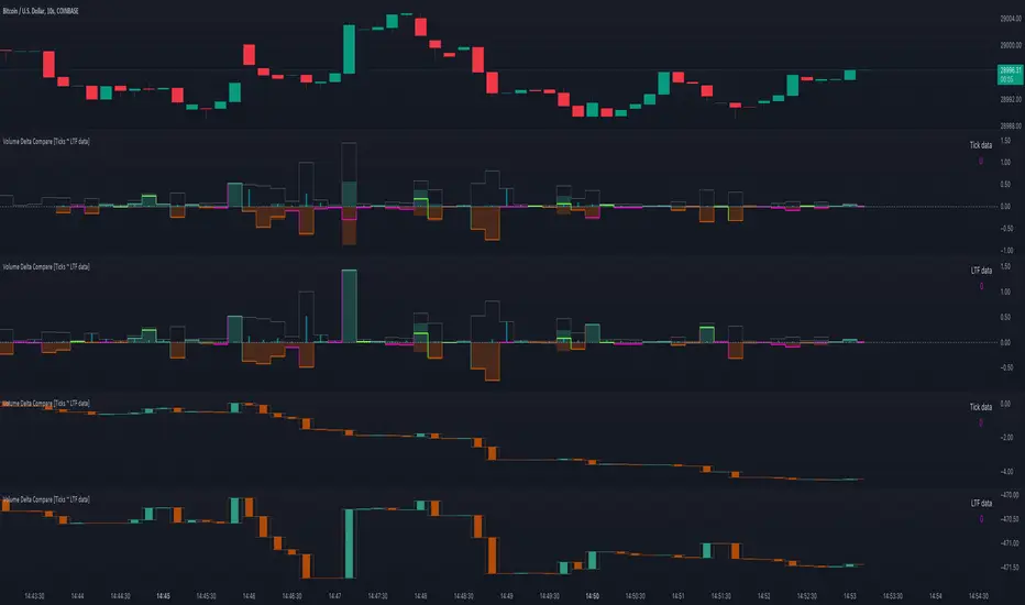 The "Volume Delta Compare [Ticks ~ LTF data]" publication shows 2 different techniques to show into-depth details of Volume, using Tick and Lower-Time-Frame (LTF) data.