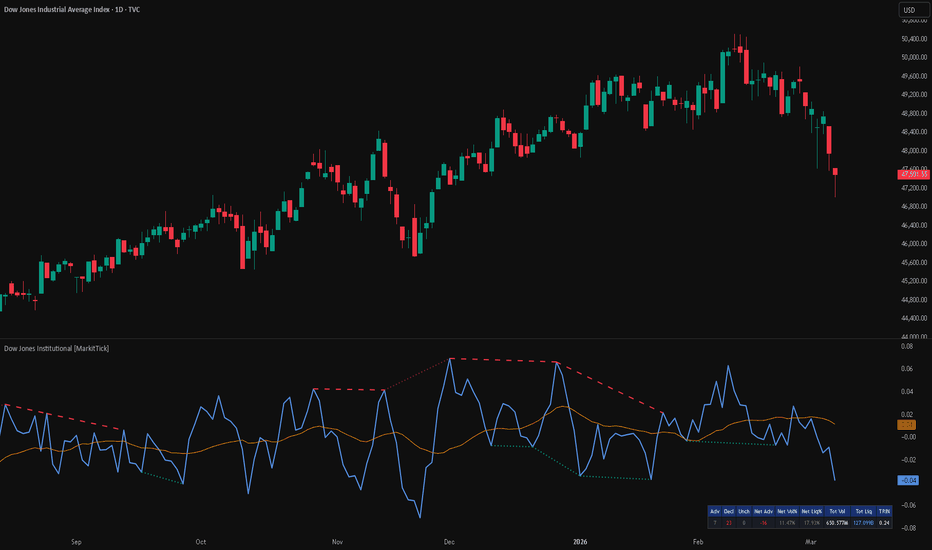 Dow Jones Institutional [MarkitTick]💡 This indicator provides a self-contained, institutional-grade market breadth suite specifically engineered for the Dow Jones Industrial Average. By directly computing the aggregate data of 30 component stocks, it delivers highly accurate internal market health metrics without relying on delayed or third-party breadth indices. It calculates five foundational market metrics dynamically, plotting them alongside an automated statistical dashboard and real-time divergence detection.