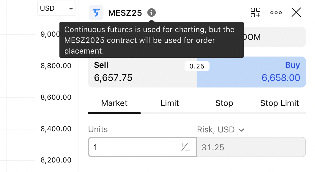 You can trade 1! continuous contracts. However, this applies only to futures from the CME and EUREX exchanges. Placing an order using a 1! continuous contract is enough to select it on the chart and place an order as usual. It is important to understand that the order will be set for the front contract, i.e., for the contract with the nearest expiration month, which is currently included in the 1! contract.