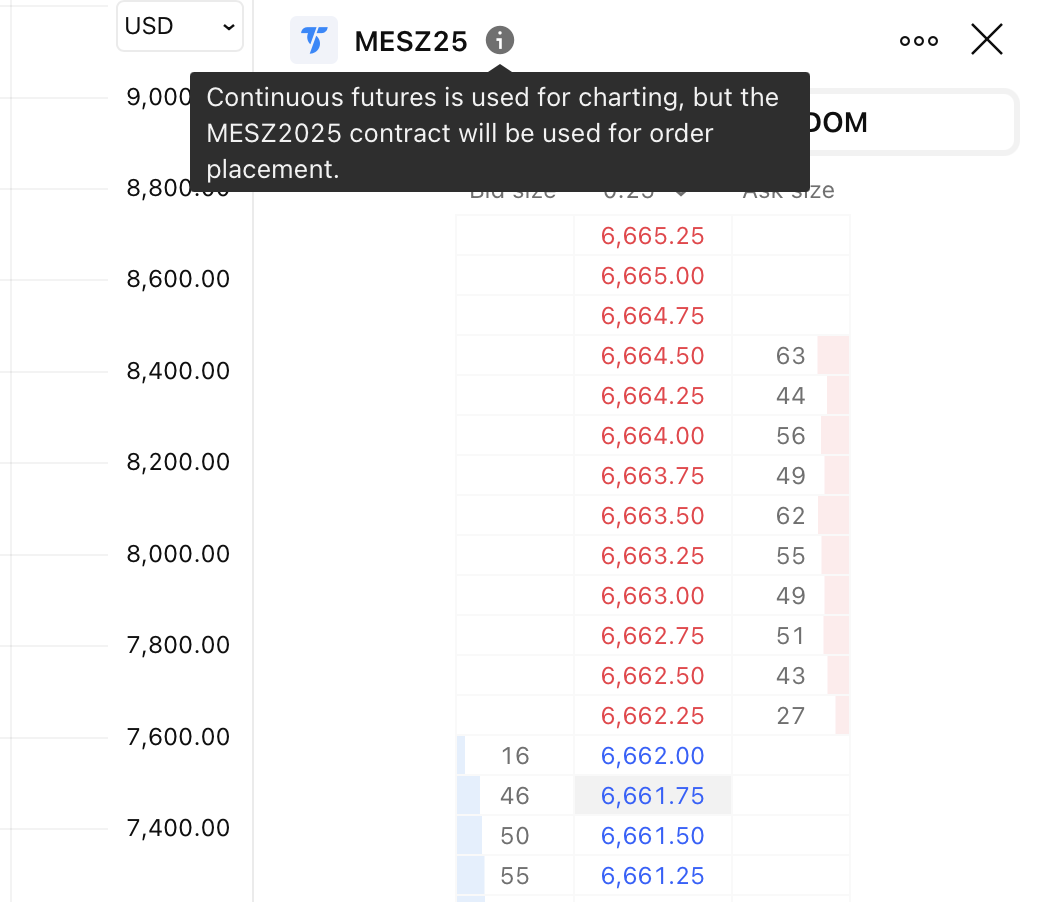 We also show exactly which contract the order will be placed in for you to look at. You can see this in the Order Panel, in the DOM, and next to the Buy/Sell buttons (when instant order placement is enabled).