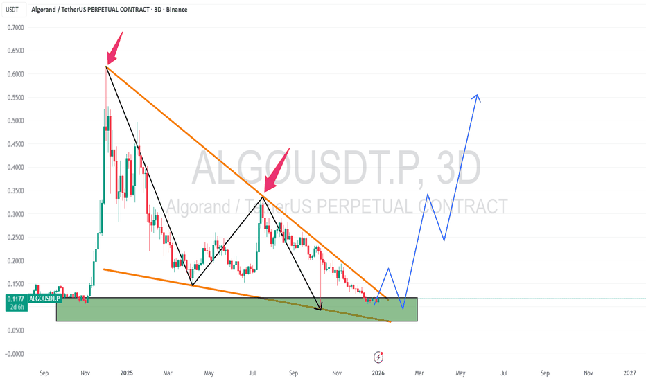 ALGO Holding Macro Support While Compressing Under Descending ReALGO is trading at a long-term support zone that has acted as a demand base multiple times in the past. Price recently moved inside a descending corrective structure, with lower highs pressing against horizontal support.