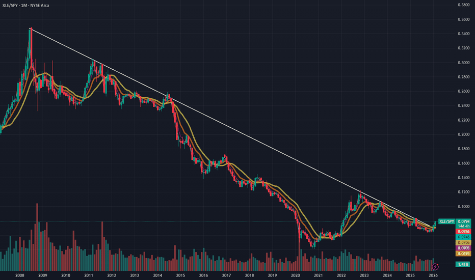 XLE vs SPX: Structural Underweight and Sentiment ExtremeThe energy sector relative to the S&P 500 has been in a persistent downtrend for over a decade, reflecting capital flight, policy pressure, and sustained underinvestment. This relative collapse culminated in a major sentiment signal in 2020, when Exxon Mobil was removed from the S&P 500, a symbolic