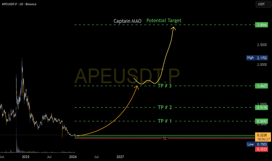 APE/USDT >>>+1000% mid term hold APE/USDT is trading near the $0.20 zone, massively discounted from its ATH around $28. After a brutal multi-year downtrend, price has just completed a liquidity sweep and weak-hand shakeout, a behavior typically seen near macro bottoms rather than continuation tops.