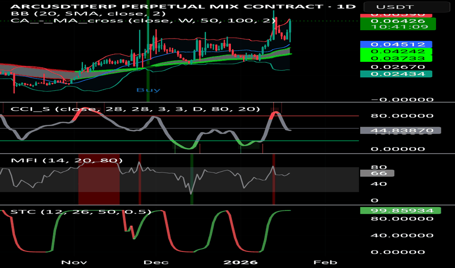 ARCUSDT shows a steady recovery with a +19.15% gain, supported ARCUSDT shows a steady recovery with a +19.15% gain, supported by a "Buy" signal on the chart and a crossover of moving averages. The STC has hit 99.92, signaling that the bullish cycle is fully matured and active. We observe the price holding above the SMA 20, which now acts as a dynamic support le