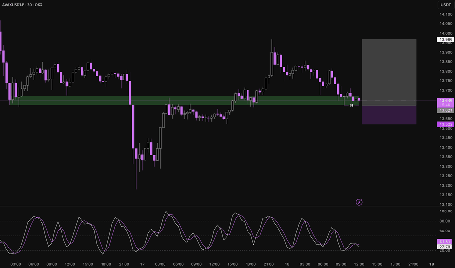 AVAX/USDT: Demand Sweep Long (Stoch Cross Trigger)On the OKX:AVAXUSDT.P 30-minute chart, price has pulled back into a well-defined demand zone (green) and just swept the prior swing low (SS), which often acts as a liquidity grab before a reversal. Structure is still bearish short-term (descending trendline), so I’m treating this as a reactive lo