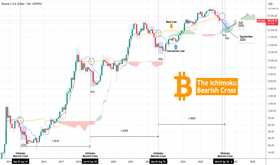 BITCOIN The Ichimoku Cross that signals the beginning of the endBitcoin (BTCUSD) has historically bottomed inside 3-4 months after its Ichimoku Conversion line (blue trend-line) crossed below its Base line (orange trend-line) on the 1M time-frame. This is what we call 'The Ichimoku Bearish Cross'.