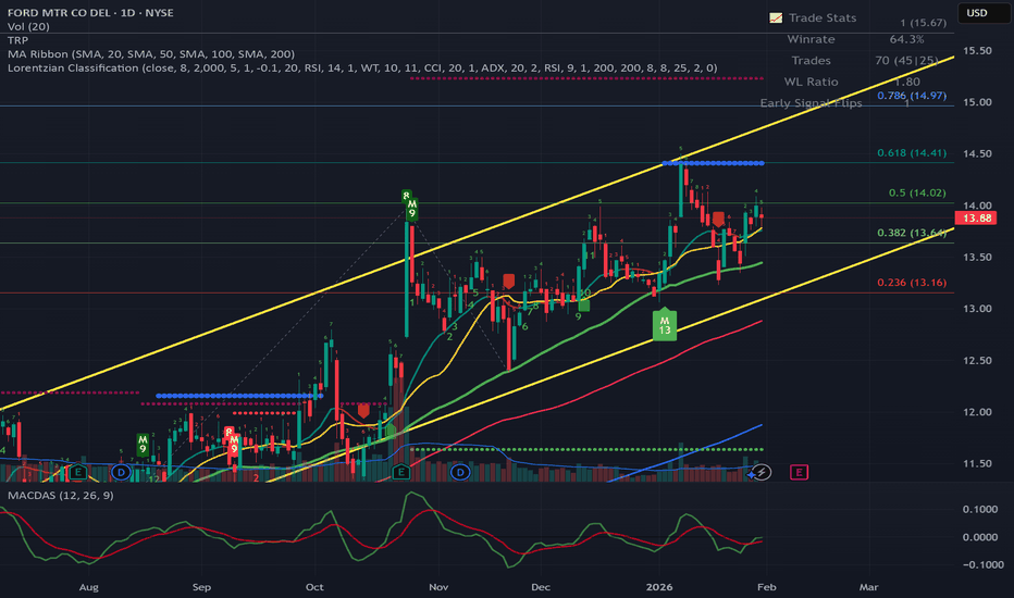 Going for a drive with F -- long at 13.81Ford has been in a strong uptrend really since the beginning of 2025. Until it proves me wrong, I have to respect that. Add in 5 consecutive down days and my signals screaming BUY at me for the last 2 days, and I just can't resist.