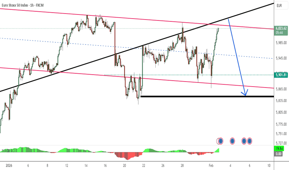 EUR50 Index recently reversed from the resistance area between the resistance level 6040.00, upper daily Bollinger Band and the resistance trendline of the daily up channel from December.