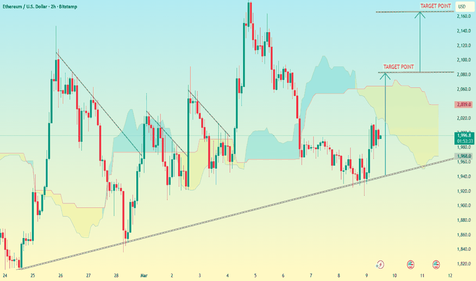 Ethereum / US Dollar (ETHUSD) on the 2H timeframe...Ethereum / US Dollar (ETHUSD) on the 2H timeframe with the Ichimoku Cloud. Price is bouncing from the trendline support, which suggests a possible bullish move. 📈