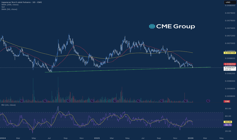 Japanese Yen Near Recent LowsRecent selling pressure in Japanese yen futures has intensified as 2026 begins, driven primarily by a widening "policy divergence" between the Bank of Japan and other major central banks. Despite a slight move toward normalization late last year, the BoJ has maintained a cautious stance, with market