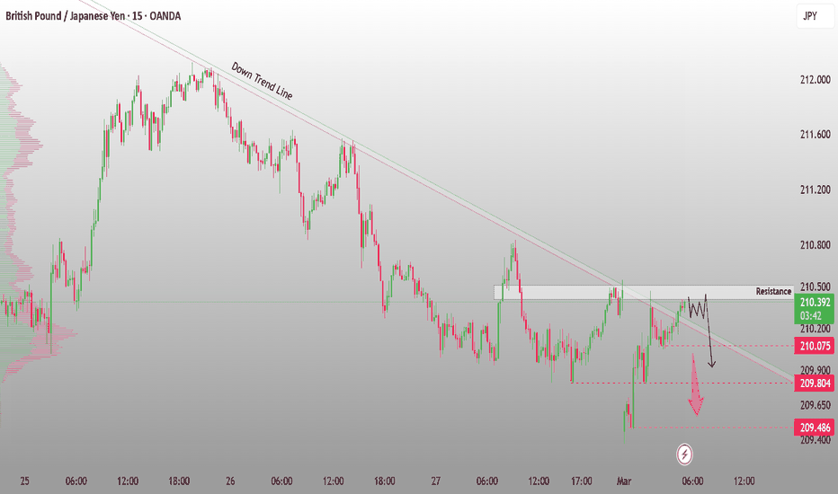 GBPJPY is respecting a clear downtrend line, with price reacting from a key resistance area, signaling strong selling pressure on the 15-minute timeframe.