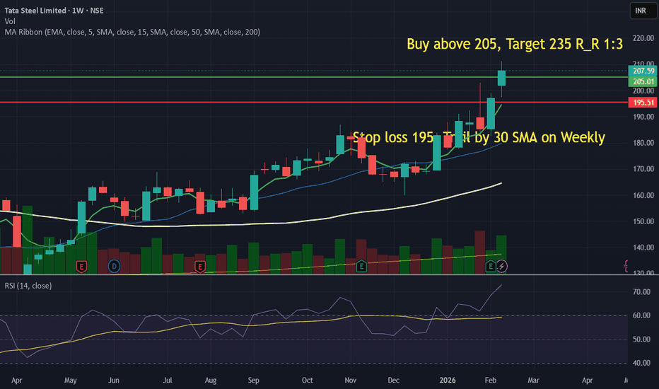TATA STEEL | Weekly | All Time High BreakoutTata Steel is forming a clean cup pattern on the weekly chart after a long consolidation. Price is holding above rising 20 & 200 WMA, showing strong institutional support.
