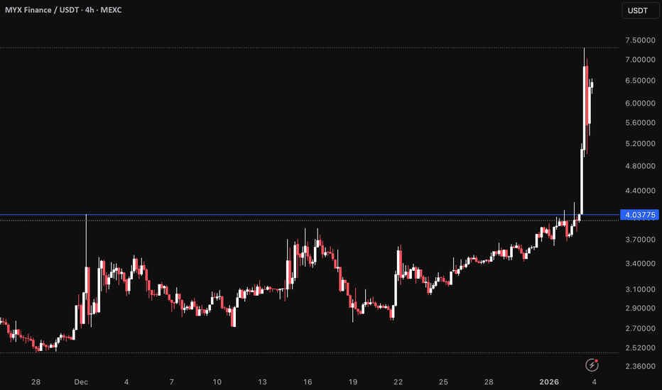 MYX Finance Explosive Breakout. Momentum Expansion After Range RMYX has completed a clear range resolution after weeks of consolidation, breaking decisively above the former resistance around the 4.00 area. The breakout triggered a strong momentum expansion, pushing price rapidly into the 6.00–7.00 zone with elevated volatility and volume.