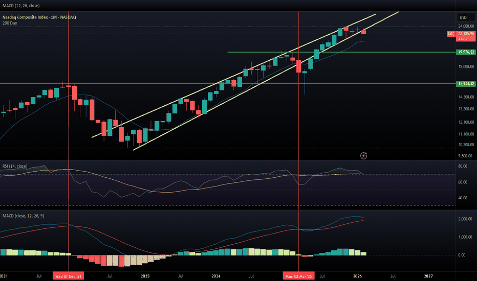 IXIC - Support Flipped Resistance Trend LineThis is the monthly chart for IXIC and the trend line encompasses all of price history