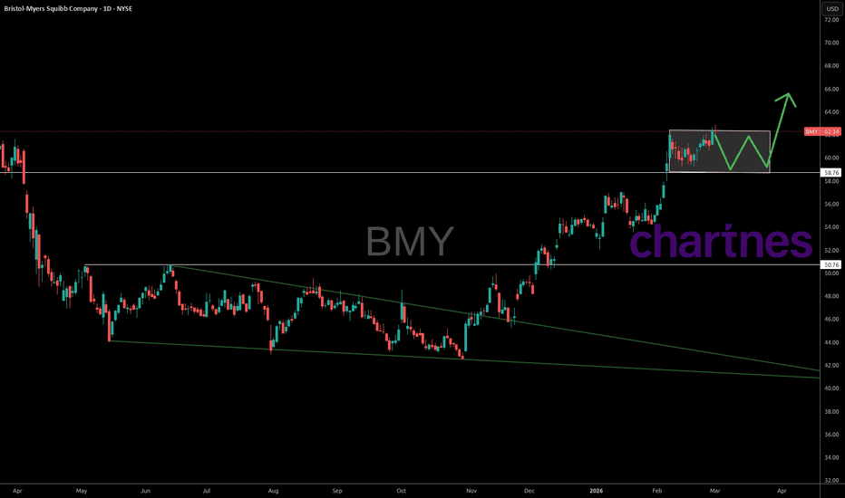 BMY reversal base, range near highs stays constructiveAfter a down phase, BMY built a base that looks like a descending pennant.