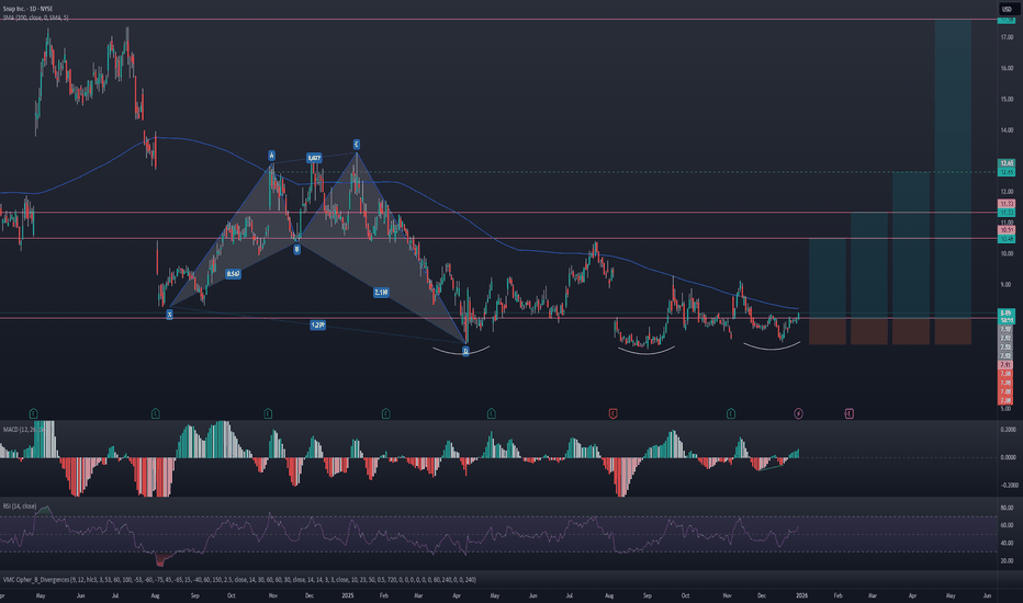 SNAP Long IdeaSNAP Long idea. Potential Bullish shark harmonic pattern and the pattern completion zone is at a key level that goes back to the 2020 Covid low (~$7.90). There is some classic bullish divergence on the daily MacD. It could be more of a range play since no higher highs have been put in. However, at t
