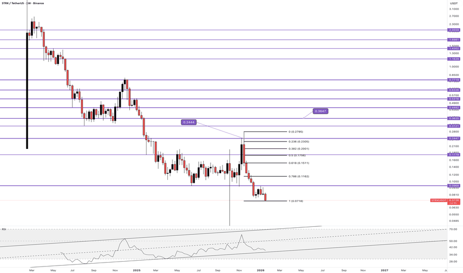 STRK/USDT — Price Breakdown With RSI Structural DivergencePrice has reached one of the targets and then resumed a sharp sell-off.