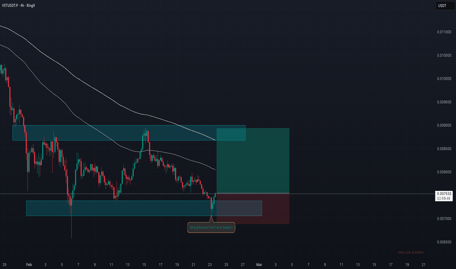 VeChain (VET): Expecting Smaller Bounce From Local Support | EMAVET failed the first reversal attempt and dropped back into the local support zone. Since then, sellers slowed down and buyers started to show small signs of recovery. As long as this support holds, the most logical move from here is a push back into the EMAs for a proper re-test.