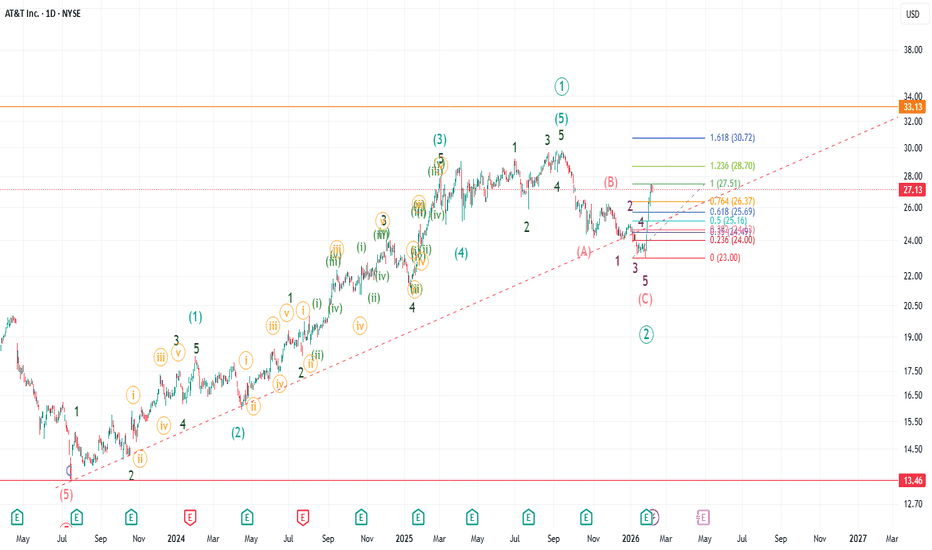 T: Approaching the Buy ZoneThe dividend king AT&T is progressing with the intermediate wave C of primary wave 2. There is a lot of confluence support between $23 and $20. If that support box breaks, then $18 - $17 is another major cluster of support. Good thing about these boomer stocks is that they don't fluctuate that fast.