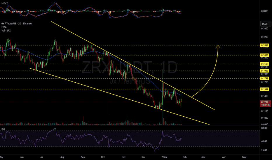 ZRXUSDT 1D#ZRX is trading within a falling wedge on the daily chart. Entry is recommended only after a clean breakout above both the wedge resistance and the daily EMA50. If confirmed, the potential upside targets are: