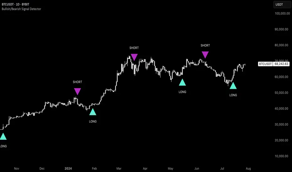 The primary purpose of this script is to assist traders in identifying potential entry and exit points in the market by signaling bullish and bearish conditions. This automated detection helps traders make more informed decisions without the need to manually analyze complex indicators. By overlaying signals directly on the price chart, the script allows for quick visual identification of market trends and reversals.