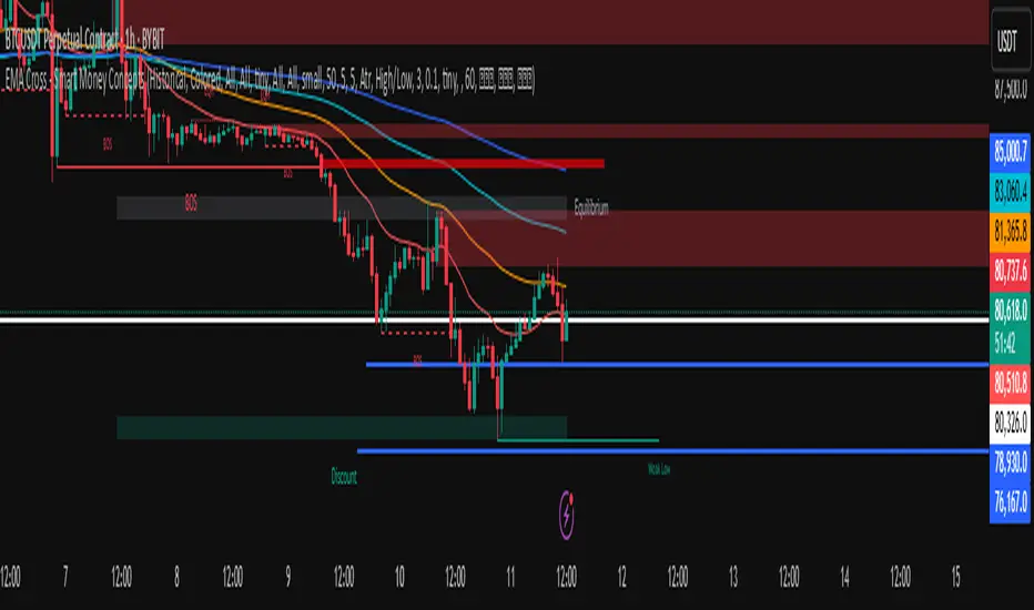 Este indicador combina los conceptos de Smart Money con medias móviles exponenciales (EMAs) para proporcionar una visión completa del mercado.