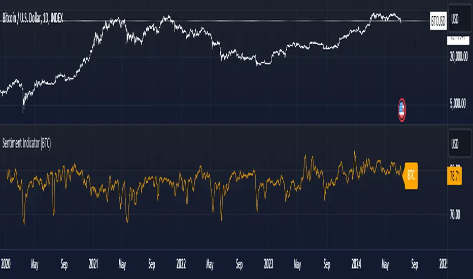 This indicator displays sentiment scores and their 7-period simple moving averages (SMA) for various cryptocurrencies.