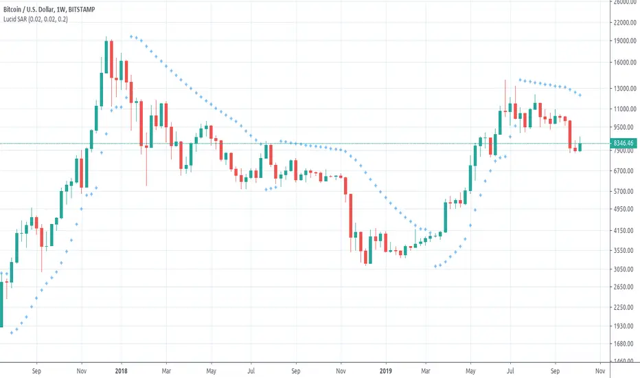 I wrote this script after having listened to Hyperwave with Sawcruhteez and Tyler Jenks of Lucid Investments Strategies LLC on July 3, 2019. They felt that the existing built-in Parabolic SAR indicator was not doing its calculations properly, and they hoped that someone might help them correct this. So I tried my hand at it, learning Pine Script as I went. I worked on it through the early morning hours and finished it by 4 am on July 4, 2019. I've added a few bits of code since, adding the rule regarding the SAR not advancing beyond the high (low) of the prior two candles during an uptrend (downtrend), but the core script is as it was.
