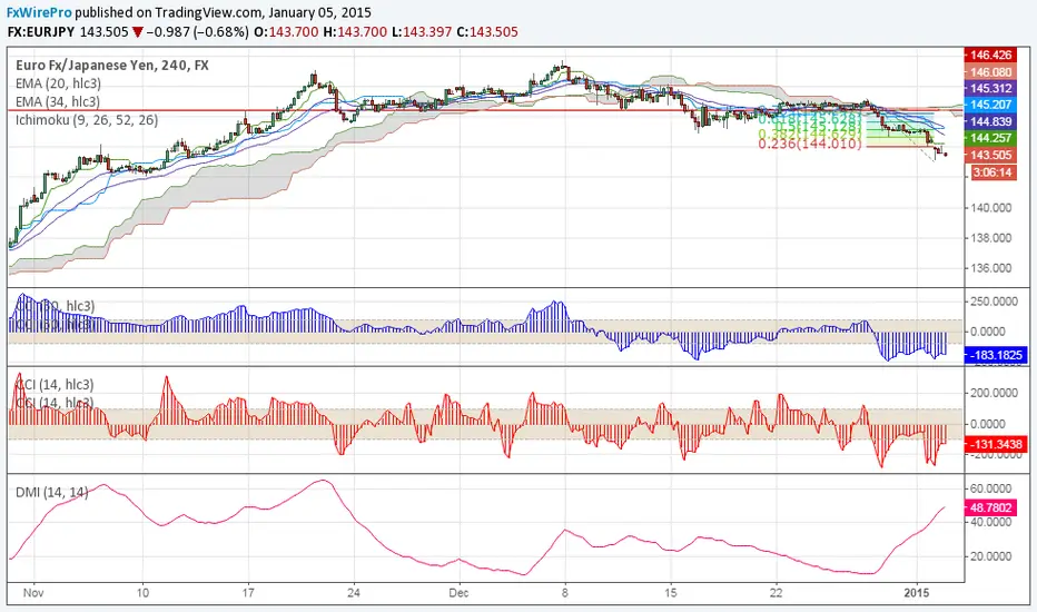 EUR/JPY has made a low of 143 and is slightly recovering from that level. Overall trend is bearish as long as resistance 145.65 holds.