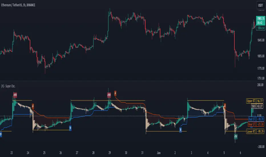 The SSO is derived from the SuperTrend and the source price. It calculates the standardized difference between the SuperTrend and the source price. The standardization is achieved by dividing this difference by the distance between the upper and lower bounds of the SuperTrend.