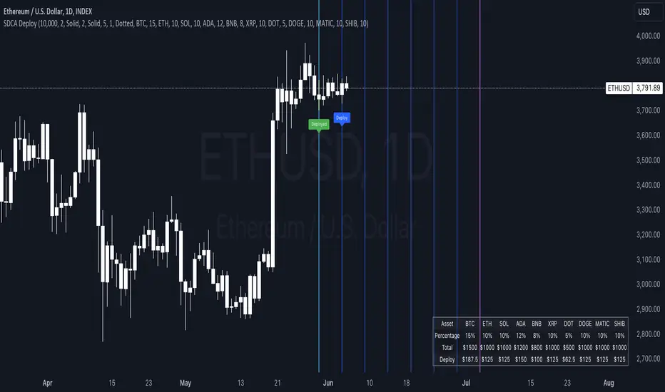 The "SDCA Deploy" indicator is designed for investors who want to implement a Dollar-Cost Averaging (DCA) strategy in the market. Dollar-Cost Averaging involves spreading your investments over regular intervals to reduce the impact of market volatility and achieve a better average entry price over time. This tool helps you manage and visualize the systematic deployment of funds across multiple assets over a specified period of up to 12 months.Key Features: